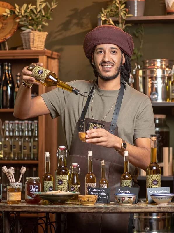 Griekenland, Spanje, Italië, Marokko … Taoufik is voortdurend op reis om de boomgaarden waar zijn olie vandaan komt, te bezoeken. “Ik praat met de boeren, kijk wat voor machines ze gebruiken bij de persing, controleer of er geen bladeren of andere rommel worden meegeperst, of er niets wordt toegevoegd. Alleen zo kan ik de allerbeste en meest zuivere producten garanderen.” Dat is uitsluitend olijfolie van de eerste persing, Vierge en Extra Vierge. Niets toegevoegd, niet bewerkt, puur natuur. Dat ruik je en dat proef je. “Hetzelfde geldt voor de arganolie die in Nederland nog betrekkelijk onbekend is. Geperst uit de geroosterde pitten van de arganvrucht uit Zuidwest-Marokko. Heel subtiel van smaak en enorm gezond.